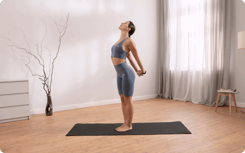 - Stand tall with your feet hip-width apart and clasp your hands behind your back.