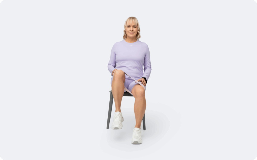 - Sit on a sturdy chair with your feet flat on the ground and your knees hip-width apart.