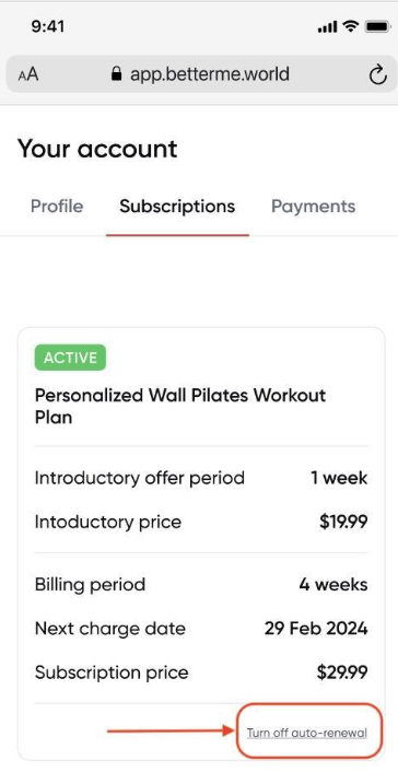 You may cancel your subscription anytime by turning off auto-renewal through your profile on our website or in the BetterMe app.Below you may find several options (that may change from time to time) on how to initiate turn off autorenewal of a web subscription: