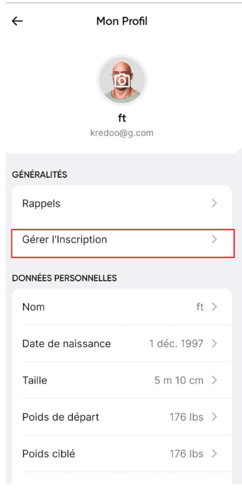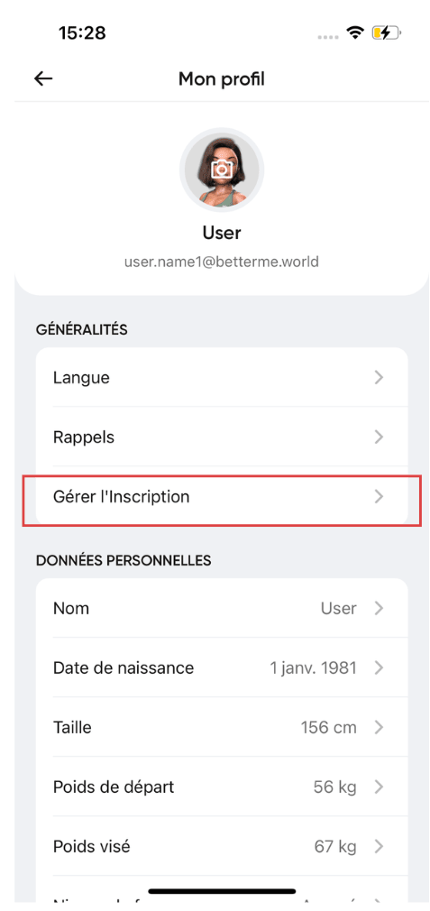 Ouvrez l'application BetterMe, accédez à votre profil, puis sélectionnez Gérer l'inscription.