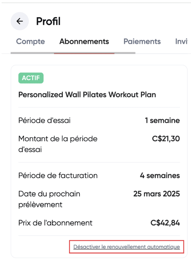Si vous désactivez le renouvellement automatique, vous aurez toujours accès aux fonctionnalités de l'abonnement pour la durée restante de la période en cours.